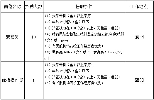 垄上人才受湖北机场集团襄阳机场公司委托,现面向社会公开招聘 11 名工作人员:安检员10人,廊桥操作员1人。